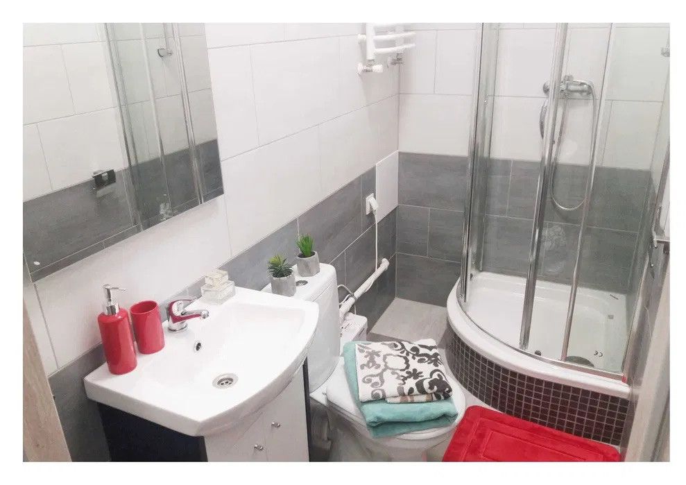 W mieszkaniu znajduję się bardzo duża kuchnia ze stołem przy którym można zjeść, w wyposażenie kuchni znajduje się lodówka, piekarnik, płyta indukcyjna i nawet zmywarka. W mieszkaniu tez są 2 pełne łazienki z prysznicami oraz wc i jedna wspólna pralka. W mieszkaniu jest rownież wspólny duży korytarz gdzie można powiesić swoje kurtki lub cos przetrzymać.