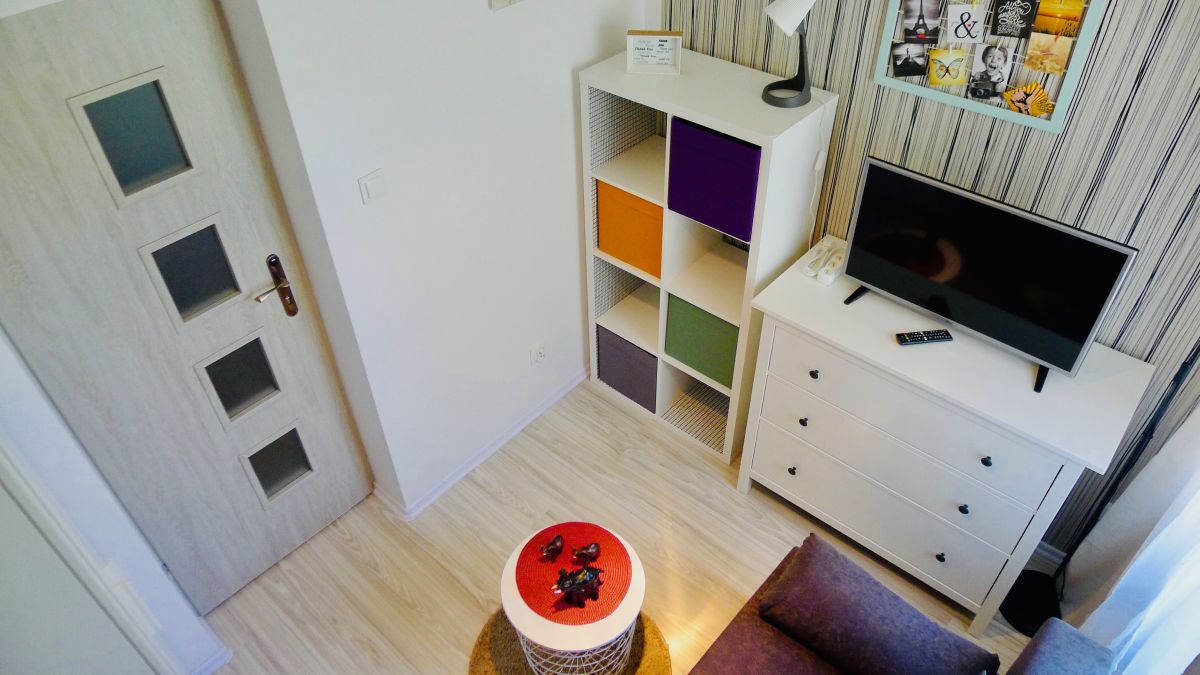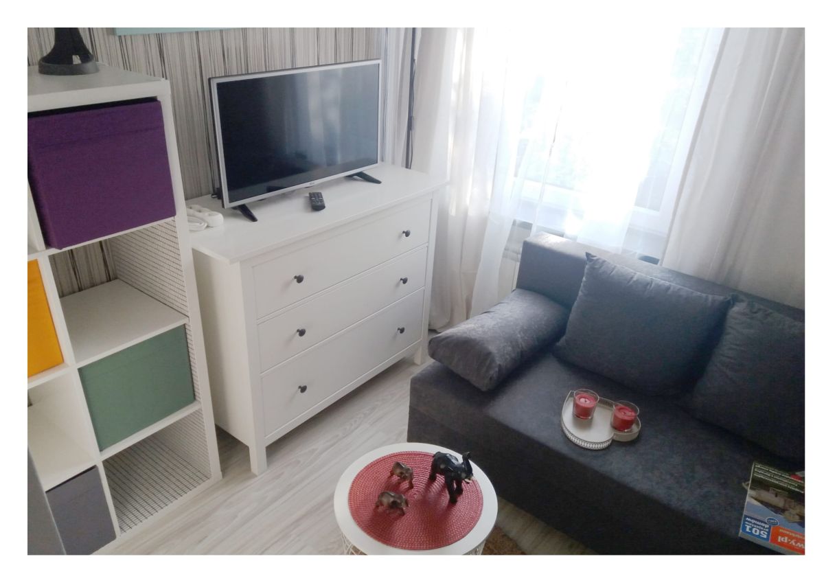 W pokoju jest kanapa z narożnikiem (rozkłada się), stolik, szafa oraz komoda.